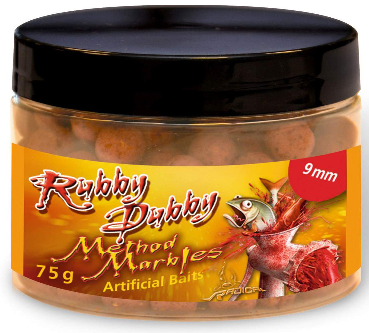 Method Marbles Rubby Dubby este o momeala de carlig , rotunda cu dimensiune redusa(9mm) indicata in pescuitul ciprinidelor.Sunt indicate a fi folosite pe monturi cu fir de par,cu momitor sau method feeder. Forma si dimensiunea redusa avand in componenta arome naturale de peste, creveti, uleiului de peste, proteine din carne de pui, faina din soia si grau, fac din method marbles o momeala irezistibila. Aceasta este genul de momeala cu timp de raspuns scurt si foarte scurt.