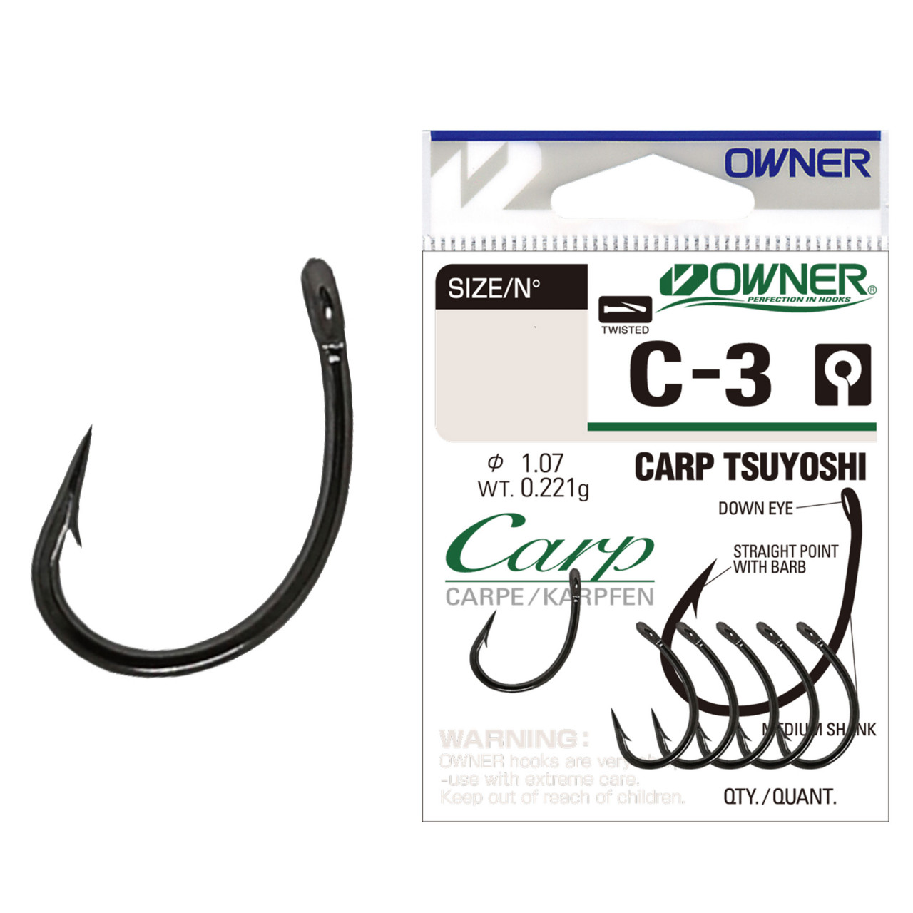 Carligele Owner din gama C-3 CARP TSUYOSHI fac parte din sortimentul CARP. Majoritatea tehnicilor de pescuit presupun experienta – pescuitul la crap cu atat mai mult. Carligele CARP TSUYOSHI au in vedere cateva principii – sa intepe foarte bine si eficient crapul, dar sa nu-l raneasca mai ales in momentul eliberarii, sa aibe legatura pe ochet astfel incat sa permita nodul fara nod si fir de par. C-3 sunt fabricate din sarma de otel Hi-CARBON tratata electrochimic, au varf CUTTING POINT si se preteaza foarte bine atat monturilor pe fir textil cat si celor pe fluorocarbon. Sunt carlige cu tija foarte scurta si varful aliniat foarte aproape de ochetul de legare. Se preteaza foarte bine monturilor de tip COMBI formate din doua segmente – unul rigid din fluorocarbon si unul foarte suplu din fir textile. Formata astfel, montura combi imbina practic supletea si naturaletea de care momeala are nevoie pentru o prezentare cat mai naturala, cu rigiditatea segmentului de fir secundar, care vine in ajutorul monturii jucand rol de proptea atunci cand pestele va incerca sa scuipe momeala. Chiar daca montura combi este in general utilizata impreuna cu momeli de fund (bottom-bait) sau critic echilibrate (balanced bait), functioneaza foarte bine si cu boabe de porumb artificiale flotante, acestea ridicandu-se usor de pe substrat, asezandu-se exact deasupra sectiunii suple a monturii. Culoarea BLACK CHROME permite o foarte buna mascare pe substrat.