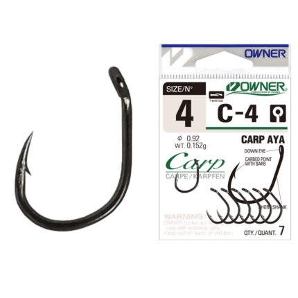 Carligele Owner din gama C-4 CARP AYA fac parte din sortimentul CARP. Majoritatea tehnicilor de pescuit presupun experienta – pescuitul la crap cu atat mai mult. Carligele CARP AYA au in vedere cateva principii – sa intepe foarte bine si eficient crapul, dar sa nu-l raneasca mai ales in momentul eliberarii, sa aibe legatura pe ochet astfel incat sa permita nodul fara nod si fir de par. C-4 sunt fabricate din sarma de otel Hi-CARBON tratata electrochimic, au varf CUTTING POINT si se preteaza foarte bine atat monturilor pe fir textil cat si celor pe fluorocarbon. Sunt carlige cu tija foarte scurta si varful proiectat pe tija in apropierea anoului de legare, ce par sa fie unele dintre cele mai eficiente pentru MONTURA PLUMB PIERDUT. Este montura la care apelam atunci cand avem de-a face cu agatatura diversa sau cand pescuim in imediata apropiere a unei buturugi, indiferent ca abordam zona din aval sau din amonte fata de structura.