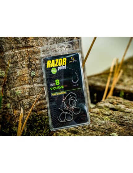 Modelul Razor V-Curve este rezultatul a doi ani de testare si dezvoltare, fiind imbunatatit constant, prin colaborarea cu pescari de top, avand ca scop obtinerea unui carlig ideal pentru pescuitul la crap. Are o forma unica, usor atipica (curbura in V), iar la baza fabricarii acestor carlige sunt aceleasi elemente consacrate pe care le gasim la celelalte carlige din gama Razor Point.