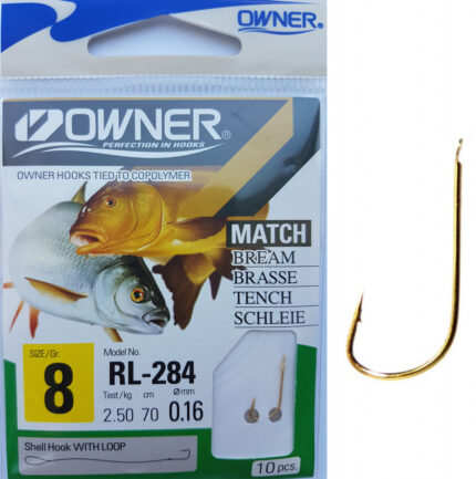 Carligele legate Owner din gama RL-284 sunt produse specializate dedicate pescuitului anumitor specii (vezi poza de pe plic), utilizand tehnici si stiluri dedicate. Au in componenta carlige Owner 50284 SODE (de culoare galben auriu) si fire monofilament (copolymer) made in Japan. Aceasta gama de carlige legate este utilizata in special de catre pescarii de stationar (feeder, method feeder, match, sheffield, crap, varga, etc.). Se preteaza pescuitului la crap, caras, platica, babusca, etc. cu momeli vii (viermi, rame), dar si cu porumb, pelete, mamaliga, etc. In functie de dimensiunea carligului au fost utilizate fire cu dimensiuni de 0.12, 0.14, 0.16, 0.18mm. Acest produs va scuteste de a mai lega carlige pe malul apei sau in barca, mai ales atunci cand este frig afara, v-ati uitat ochelarii, sau v-au inghetat mainile. Deasemenea va scuteste de achizitionarea, transportul si gestionarea separata a fiecarei componente in parte.