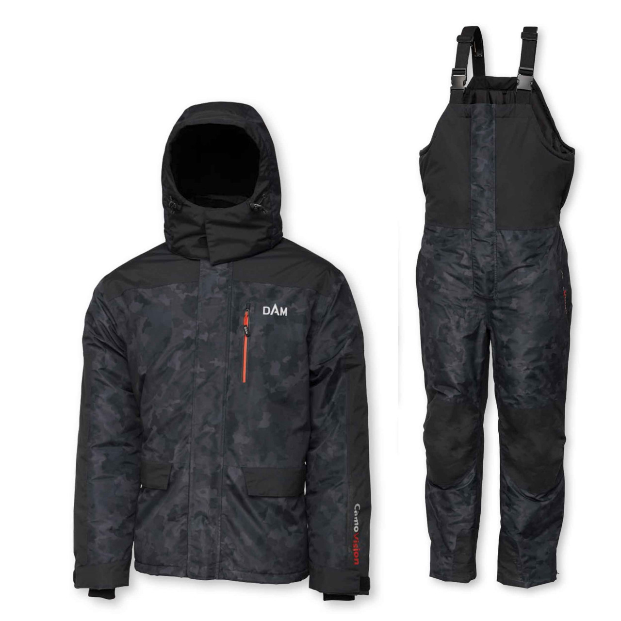 DAM Camovision Thermosuit este un costum format din 2 piese, Jacheta si pantaloni cu pieptar. Este un costum de iarna, pentru vreme vantoasa, ploioasa si rece. Materialul excelent din care este confectionat este 100 polyester, cu membrana waterproof TPU, densitate 8,000mm, grad de respirabilitate 5,000mvp. Designul materialului este comoVision cu patent negru/gri, cu cusaturi intarite in zonele cele mai expuse la ruptura, adica la coate, genunchi si zona dorsala, ceea ce ii confera o rezistenta mult sporita in timp. Shell-ul care este materialul de baza este polyester Taslon si polyester 160gsm densitate Thermo insulation. Fermoarele de inchidere sunt de dimensiuni mari, rezistente, cu inchidere in ambele sensuri, atat la jacheta , cat si la pantaloni. Pe fata jachetei sunt buzunare largi, cu fermoare si cu flapsuri. Gluga este detasabila si ajustabila ca dimensiune. Pantalonii cu pieptar dispun de 2 buzunare cu fermoar deasemeni, bretele ajustabile, la baza pantalonului, la picior sunt fermoare lungi, cu arici si banda de ajustare pe bocanc , pentru a impiedica patrunderea vantului sau a frigului.