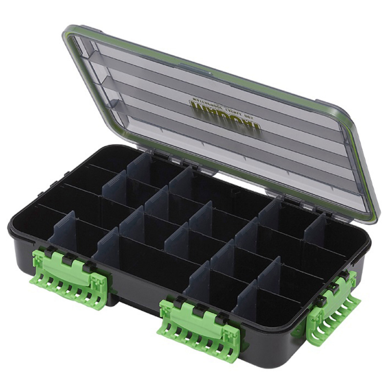 Cutie cu capac inchis la culoare conceputa pentru protectia de supraincalzire a accesoriilor depozitate in interior. Se livreaza cu doua separatoare care impart compartimentul central in trei mici compartimente. Este ideala pentru varteje, carlige, fire sau orice alt accesoru pe care il vom folosi la realizarea monturilor pentru somn. Capacul are un bandou din silicon care asigura o impermeabilitate perfecta a continutului, chiar si in conditii de ploaie. Cutia beneficiaza de patru clapete de securizare supradimensionate si doua balamale solide pentru capac. CARACTERISTICI: Dimensiune: 35x22x8cm, capac cu protectie de supraincalzire, bandou capac silicon pentru impermeabilizare perfecta, adancime mare (incap si rolele de forfacuri), clapete securizare solide: 4, balamale capac: 2, material: Plastic Solid Incasant ABS, logo MadCat pe capac, culori: Verde + Negru, compartiment central: 4