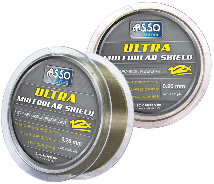 Firul Asso Ultra Molecular Shield Dark Green este dedicat in principal pescarilor de crap, putand fi la fel de util si pescarilor de feeder – method feeder. Este realizat in JAPONIA pe baza de materii prime si tehnologii japoneze. Are la baza un mix de 3 copolimeri tratati si protejati la suprafata (prin tehnologia FLUOROCARBON COATED) astfel incat sa asigure un scut molecular antiabraziv (ULTRA MOLECULAR SHIELD). Practic este unul dintre putinele fire de doua ori mai rezistent la abraziune decat oricare alta varianta de fir mono. Absorbtia de apa in spatiile intermoleculare este aproape de zero, ceea ce ii confera suplete, rezistenta sporita la rupere (test la nod), lipsa memoriei, castabilitate si protectie UV. Este prezentat pe role de 150m, 300m si 1200m, bobinate prin tehnologia PARALLEL SPOOLING pentru conservarea si mentinerea calitatilor deosebite pe timp cat mai indelungat (sporirea duratei de viata, incarcarea echilibrata a tamburului mulinetei si rezistenta la imbatranire). Culoarea VERDE INCHIS (DARK GREEN) asigura camuflarea aproape perfecta pe substratul imers.