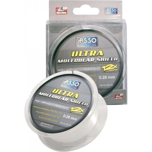 Firul Asso Ultra Molecular Shield White este dedicat in principal pescarilor de stationar – feeder, match, bologneza, rubeziana, si varga. Este realizat in JAPONIA pe baza de materii prime si tehnologii japoneze. Are la baza un mix de 3 copolimeri tratati si protejati la suprafata (prin tehnologia FLUOROCARBON COATED) astfel incat sa asigure un scut molecular antiabraziv (ULTRA MOLECULAR SHIELD). Practic este unul dintre putinele fire de doua ori mai rezistent la abraziune decat oricare alta varianta de fir mono. Absorbtia de apa in spatiile intermoleculare este aproape de zero, ceea ce ii confera suplete, rezistenta sporita la rupere (test la nod), lipsa memoriei, castabilitate si protectie UV. Culoarea este una neutra TRANSPARENT. Este prezentat pe role de 150m bobinate prin tehnologia PARALLEL SPOOLING pentru conservarea si mentinerea calitatilor deosebite pe timp cat mai indelungat (sporirea duratei de viata, incarcarea echilibrata a tamburului mulinetei si rezistenta la imbatranire).