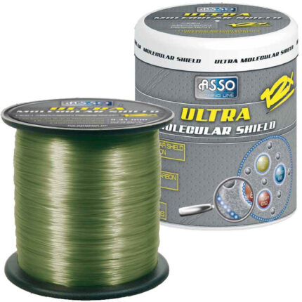 Firul Asso Ultra Molecular Shield Dark Green este dedicat in principal pescarilor de crap, putand fi la fel de util si pescarilor de feeder – method feeder. Este realizat in JAPONIA pe baza de materii prime si tehnologii japoneze. Are la baza un mix de 3 copolimeri tratati si protejati la suprafata (prin tehnologia FLUOROCARBON COATED) astfel incat sa asigure un scut molecular antiabraziv (ULTRA MOLECULAR SHIELD). Practic este unul dintre putinele fire de doua ori mai rezistent la abraziune decat oricare alta varianta de fir mono. Absorbtia de apa in spatiile intermoleculare este aproape de zero, ceea ce ii confera suplete, rezistenta sporita la rupere (test la nod), lipsa memoriei, castabilitate si protectie UV. Este prezentat pe role de 150m, 300m si 1200m, bobinate prin tehnologia PARALLEL SPOOLING pentru conservarea si mentinerea calitatilor deosebite pe timp cat mai indelungat (sporirea duratei de viata, incarcarea echilibrata a tamburului mulinetei si rezistenta la imbatranire). Culoarea VERDE INCHIS (DARK GREEN) asigura camuflarea aproape perfecta pe substratul imers.