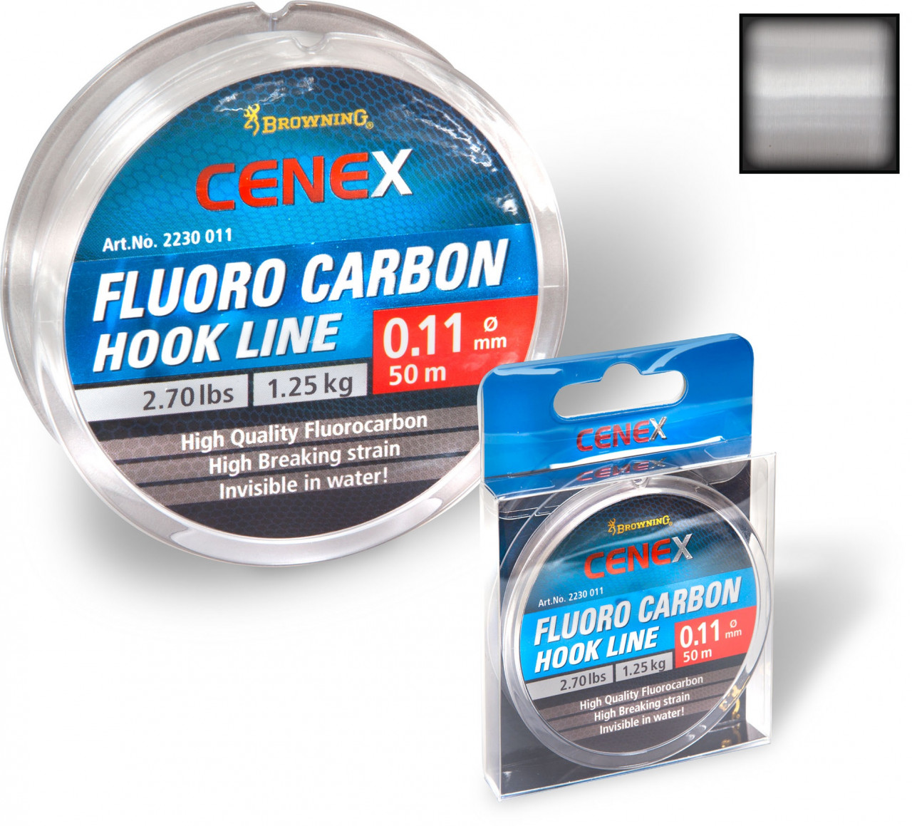 Firul Browning Cenex Fluoro Carbon Hook Line este un fluorocarbon 100% fabricat din copolimeri PVDF. Deoarece moleculele fluorocarbonului sunt mult mai compacte si dense decat ale ale nylonului, aceasta face ca fluorocarbonul sa fie mult mai greu, mai scufundabil si mai putin vizibil decat orice alt monofilament. Datorita grosimilor foarte mici, acest fir este destinat in principal pescarilor de stationar (varga, rubeziana si copca). Unii doar isi leaga carligele cu el, iar altii il folosesc inclusiv ca fir de linie. Marele avantaj pentru toti acestia este tehnologia speciala de bobinare, pentru conservarea si mentinerea calitatilor deosebite pe timp cat mai indelungat (sporirea duratei de viata si rezistenta la imbatranire), precum si prezentarea pe role mici, economice, de 50m.