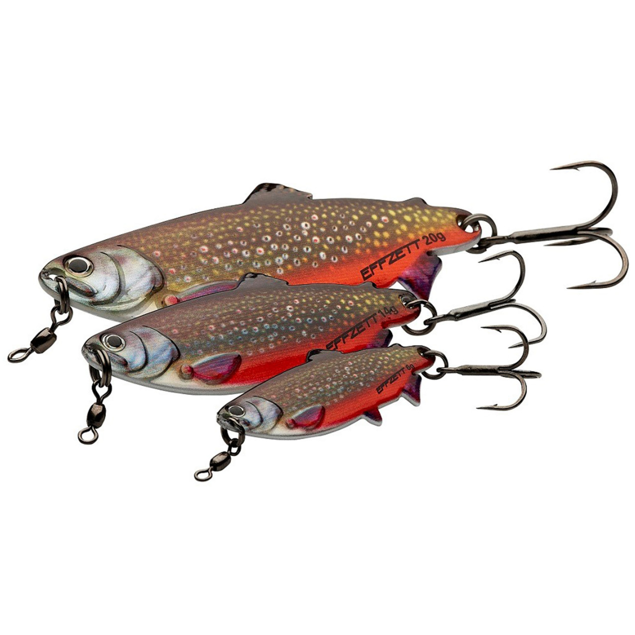 Lingurile de păstrăv EFFZETT Trout Spoon sunt continuarea extrem de solicitată a lingurilor inovatoare EFFZETT Roach Spoon și EFFZETT Perch Spoon, care au venit pe piață pentru 2020. Lingurile de păstrăv urmează conceptul lingurilor Roach Spoon și Perch Spoon, rezultând un design complet unic, bazat pe forma corpului unui adevărat păstrăv. Acțiunea distinctivă de flancare imită perfect un pește pe moarte sau rănit. Aspectul acestor momeli de zinc frumos proiectate îi va înnebuni pe pastravi. Lingurile de păstrăv EFFZETT® sunt disponibile în dimensiunile 5 cm / 5 g, 7 cm / 13 g și 9 cm / 25 g. Acest lucru le face prada perfectă pentru toți peștii prădători. Combinația dintre dimensiunea și greutatea acestor năluci le face ideale pentru pescuitul în ape puțin adânci sau peste câmpurile de buruieni. Datorită comportamentului lor excelent de turnare, sunt perfecte pentru pescarii care nu pot folosi o barcă. În plus față de decorul natural al păstrăvului curcubeu, lingurile de păstrăv EFFZETT® sunt disponibile și în culori strălucitoare și foarte vizibile, cum ar fi păstrăvul brun (Brook Trout), păstrăvul de foc (Fire Trout), pastravul curcubeu (Rainbow Trout) și păstrăvul albino (Albino Trout), decoruri foarte tentante pentru fiecare situație.