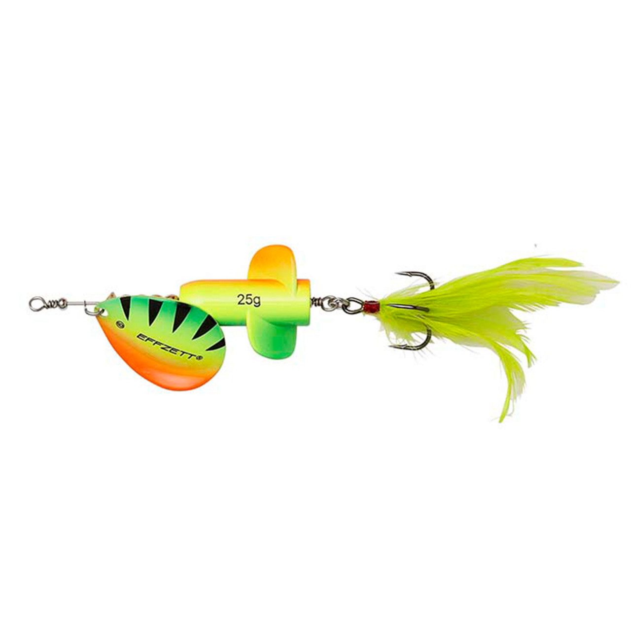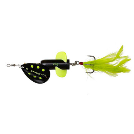 Effzett Rattlin’ Spinners sunt echipate cu unicul si inovativul corp patentat Effzett, denumit, “2-nd Generation”. Datorita aripioarelor, corpul nalucii se invarte constant sub apa si mentine bilele de otel din interior in continua miscare. Miscarea continua genereaza vibratie si zgomot, atractii fatale pentru rapitori. Effzett Rattlin Spinner mai adauga la inovatia sa inca 2 accesorii care creeaza un effect nimicitor. Datorita formei speciale a lamei, corpul si lama spinner-ului se rasucesc in permanenta in sensuri opuse. Aceste doua rotatii in sens complet opus minimizeaza rotirea sarmei pe care e montat ansamblul pana la aproape de zero, dar in acelasi timp avand o frumoasa miscare de pendulare datorita faptului ca firul nu se rasuceste. Avantaje: concept unic al corpului, 3 atractii pentru rapitori – vizual, rotatie si sunet, adaos de pene care imbraca ancora pentru o atractivitate sporita, sarma de otel de 0.9mm.