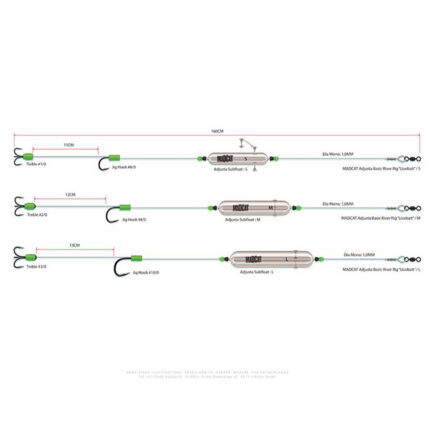 Un rig simplu dar eficient realizat cu pluta Madcat Screaming Subfloat, destinat pescuitului de fund in ape curgatoare (Dunare, Mures, Olt, Siret, Prut etc.) cu momeala vie de genul rame, lipitori, etc. Linia folosita este Madcat Ultrasoft Mono Leader de 100 mm. Lungimea totala a rig-ului este de 160cm, iar rezistenta la rupere este de 100 Lb. Dimensiunea plutei si a carligelor folosite (Madcat Jig Hook) sunt cele ce definesc clasa rig-ului – Small / Medium / Large.