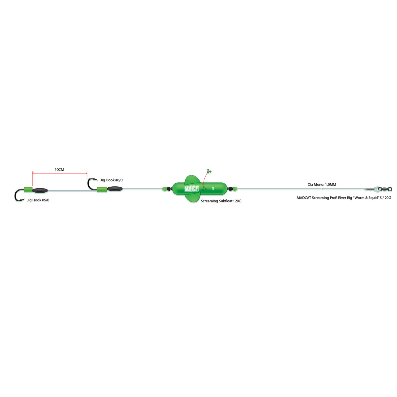Un rig simplu dar eficient realizat cu pluta Madcat Screaming Subfloat 20g, destinat pescuitului de fund in ape curgatoare (Dunare, Mures, Olt, Siret, Prut etc.) cu momeala vie de genul rame, lipitori, etc. Linia folosita este Madcat Ultrasoft Mono Leader de 100 mm. Lungimea totala a rig-ului este de 180cm, iar rezistenta la rupere este de 100 Lb. Dimensiunea plutei si a carligelor folosite este S (short).
